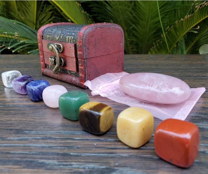 8 tumbled chakra crystals ( Clear Quartz, Amethyst, Sodalite, Green Aventurine, Rose Quartz, Tiger’s eye, Yellow Jade, Red Jasper) 0.5”-1"