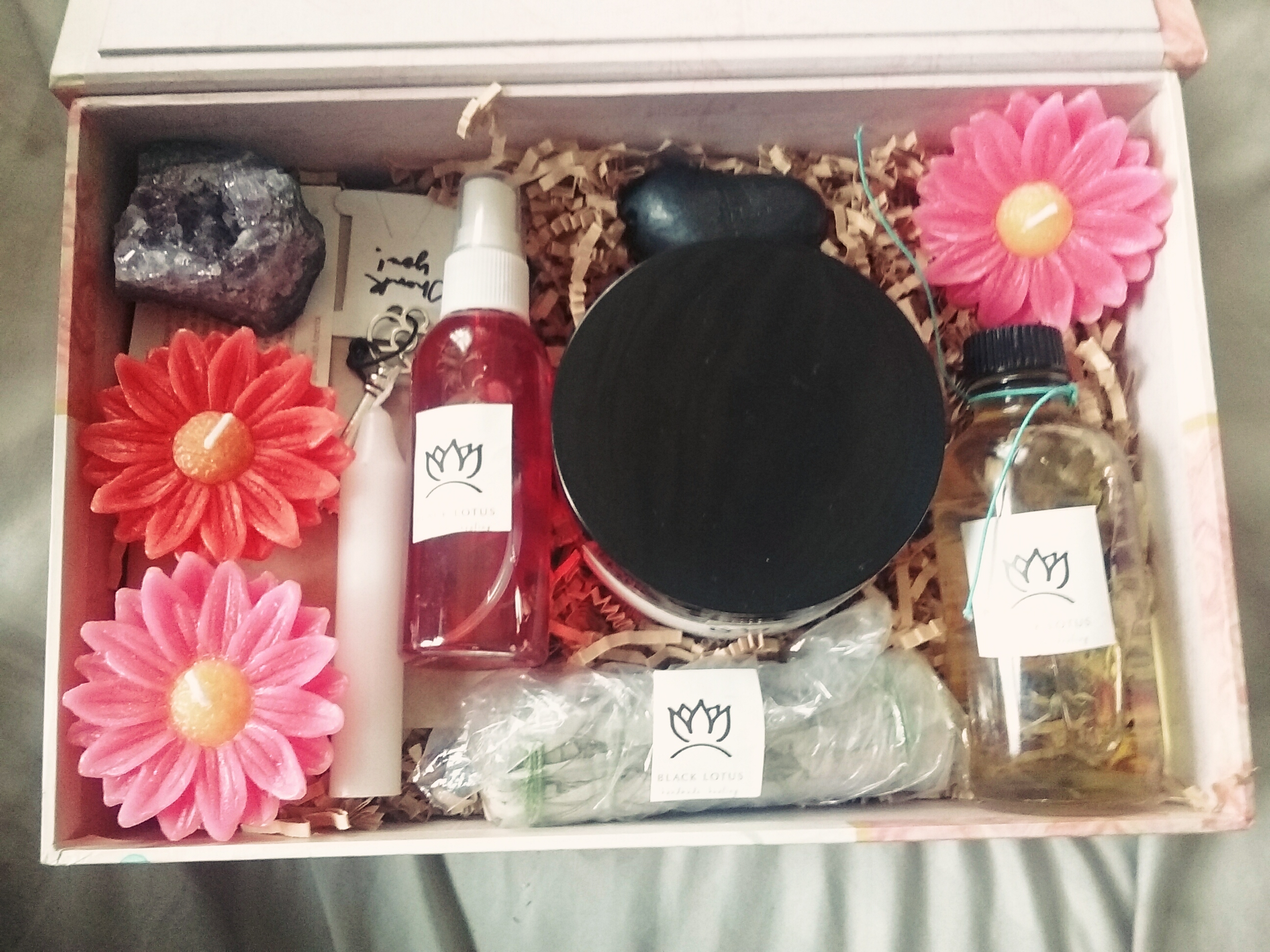 Aka The Goodie Box contains generous sample sizes of products like original whipped shea butter 4oz. two crystals(randomly selected ), herbal oat bath tea (3pack), Soul Tuner Spray, Sage, Intention Candle, Journal (designs vary,) Bath Soak, Boxed with love. Boxes /Basket Designs Vary will be either a box or basket depending on stock. Great value. Lots of love.