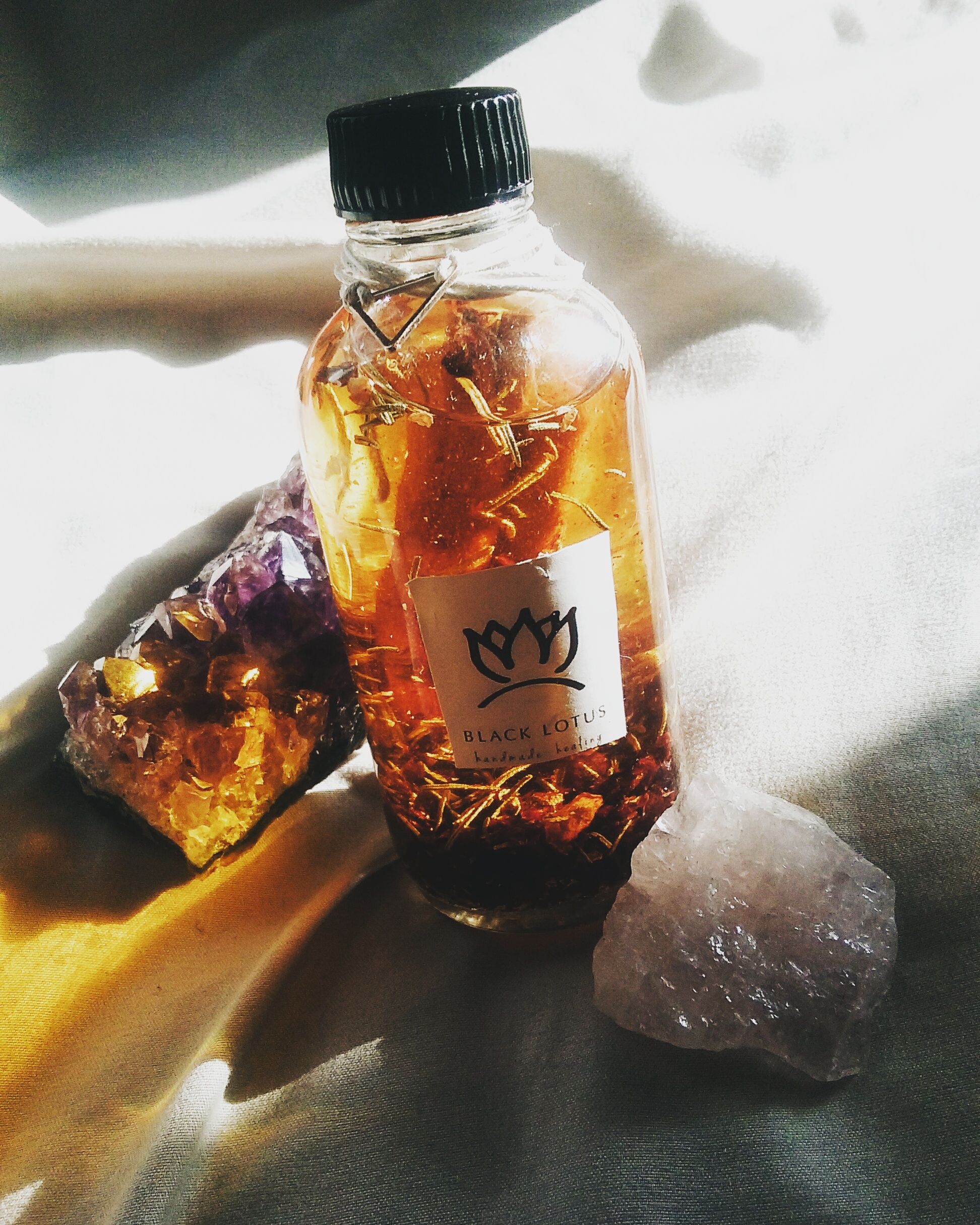 Grapeseed oil blended into love with essential oils of frankincense, cedarwood, lavender, tea tree, and tangerine. Infused with jasmine, lavender, rose, rosemary, chamomile, calendula, and quartz crystals. Comes with charm around neck of bottle.